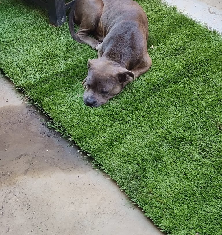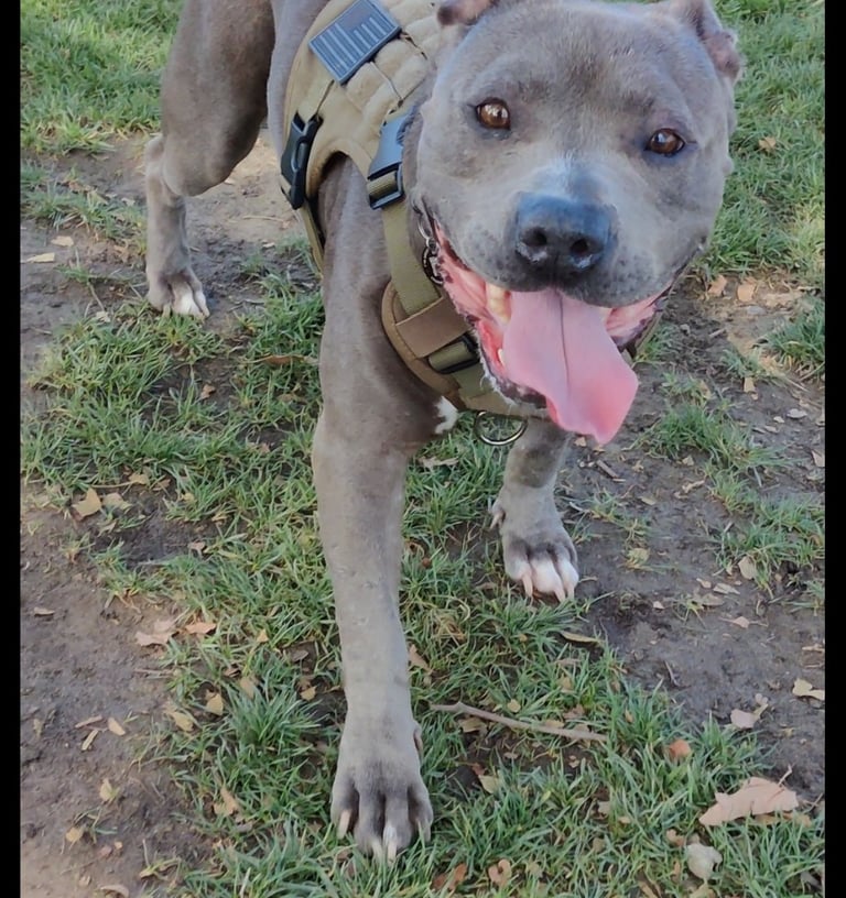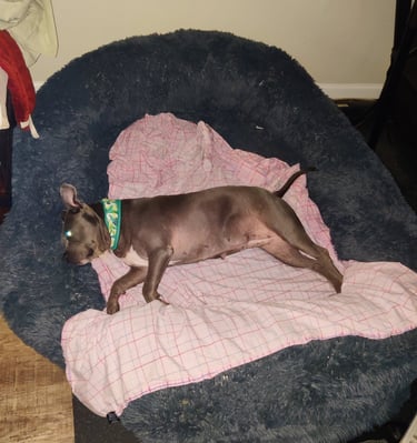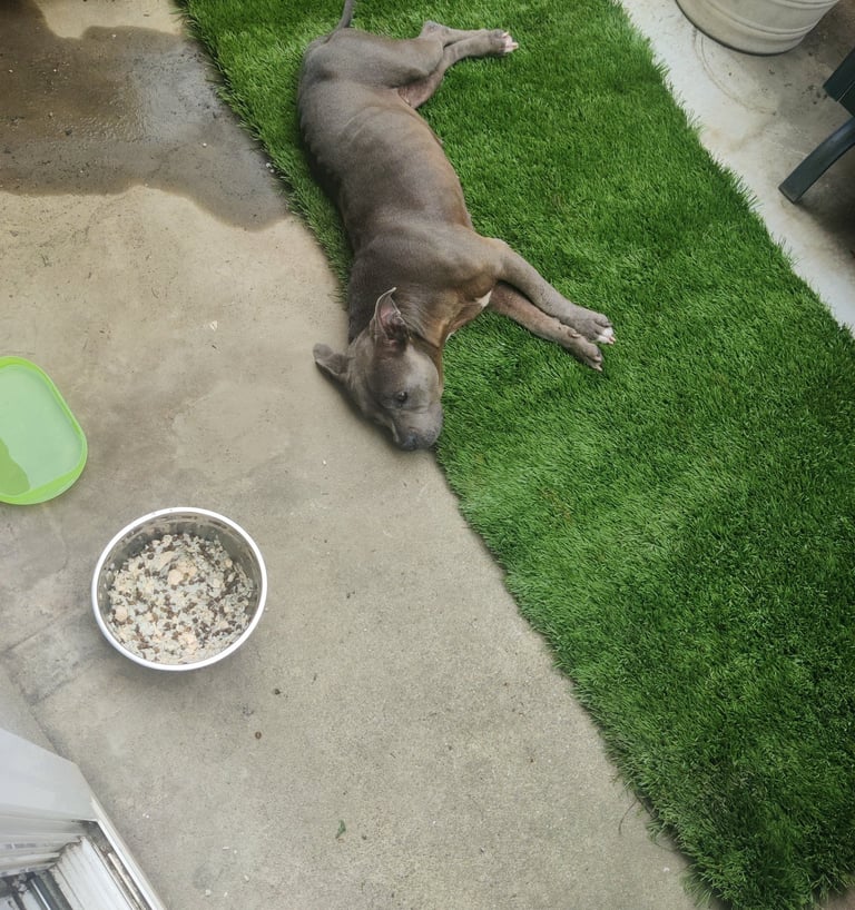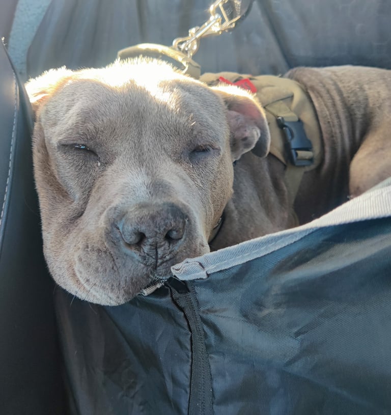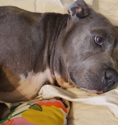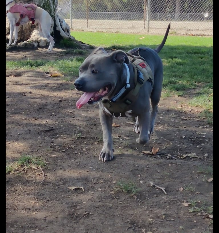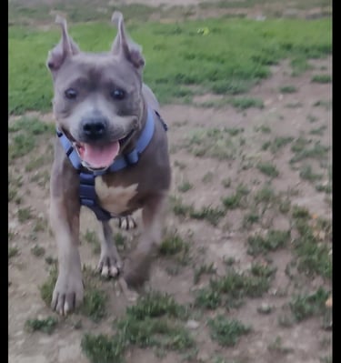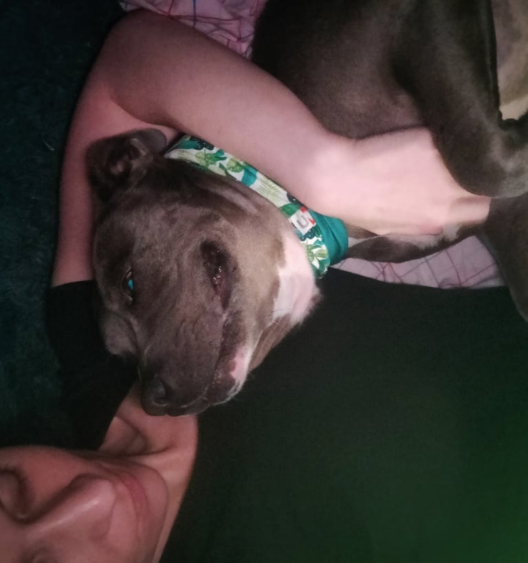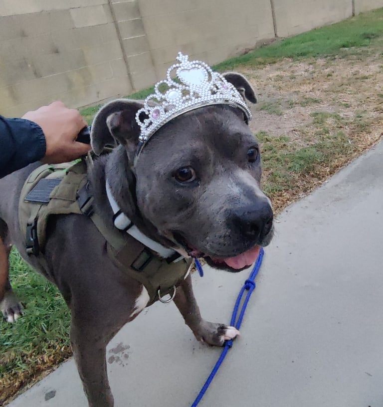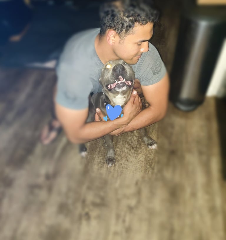 In July 2024, we found Little Pea, a beautiful Staffordshire Terrier, abandoned in Compton, CA. She was very skinny, sick, and injured. Veterinarians believe she was likely used for breeding and then abandoned, as she had recently given birth and is now a senior dog. With no shelters or rescues able to take her in, and our hearts unwilling to let her be discarded or euthanized, we knew we had to act. Living in an apartment without a yard, we could not keep Pea with us, so we asked Grandma if she could give Pea a loving home. Grandma agreed, and we promised to take care of all her needs.